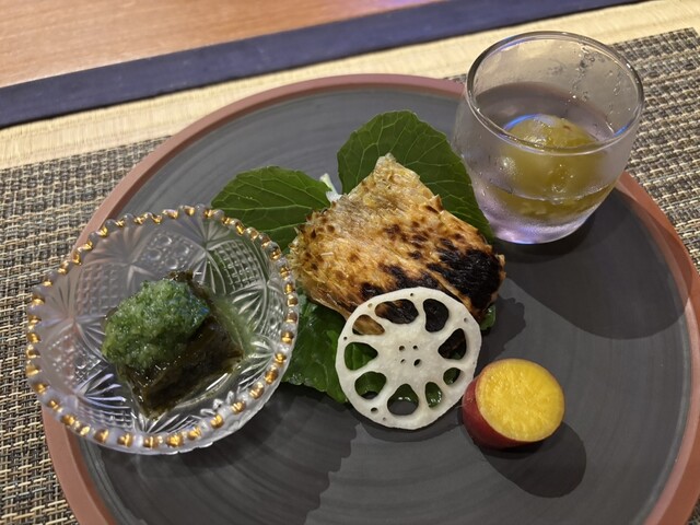 六品目は「甘鯛松笠焼き」。レンコンはぴりっとと酢漬けの味。甘鯛はパリパリとした食感で、程よい塩味が美味しさを引き立てる。