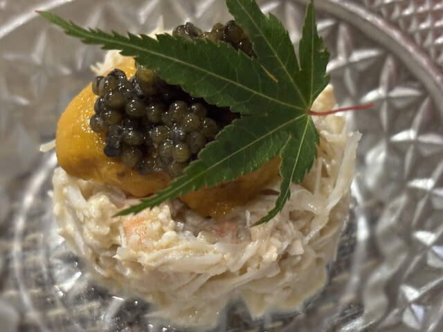 五品目は「佐渡産毛蟹とウニ」。ウニをひと口食べれば、磯の香りが口に広がる。蟹身ももちろん美味い。佐渡の海の風味なのかな。