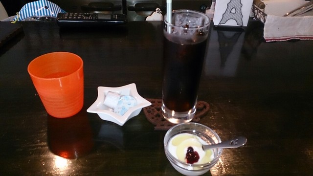 カレーを食べ終えたタイミングを見計らってドリンクとプチデザート配膳。