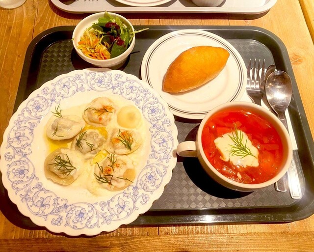 ボルシチ、サラダ、ペリメニ、ピロシキ