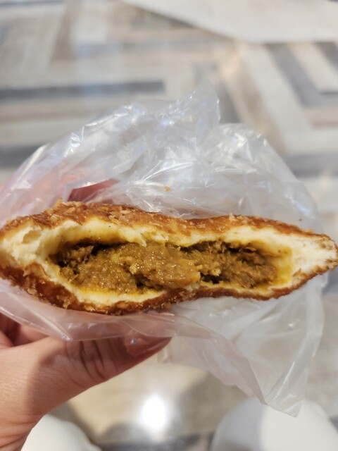 人気の黒豚甘口カレーパン、薄い生地とボリュームたっぷりの中身がとても美味しかった。