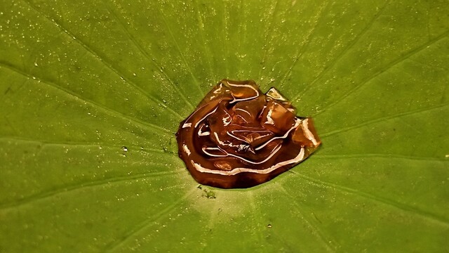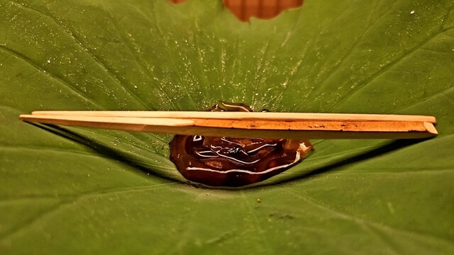 葛切りを蓮の葉の上に乗せて黒蜜をかけたもの。