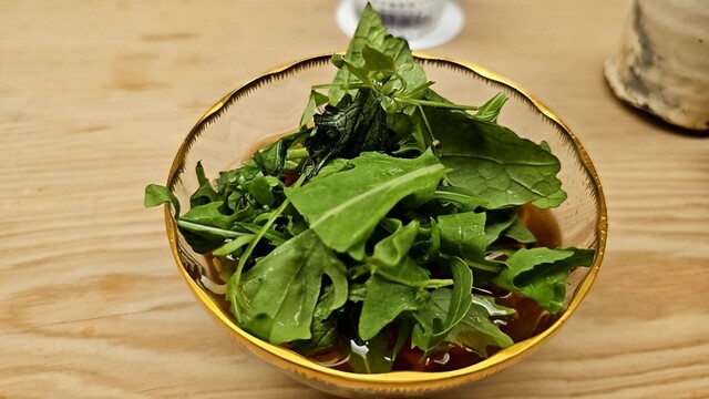 数種類の苦味のあるハーブが乗った優しいお出汁のお蕎麦。