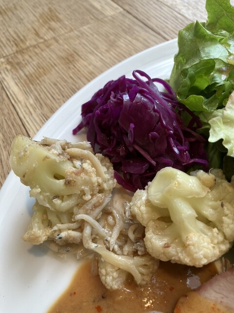 この日の注文は数量限定という「ローストポークプレート」。たっぷりのポークはしっとりとジューシーで、上からかかったソースがまた絶妙。たくさんの野菜と一緒に盛られたプレートは、見た目からして映えていて、テンションが上がる。ボリュームも申し分なく、しっかり“満腹ウマ”。スープはミネストローネ風で、トマトの酸味が効いており、全体のバランスも良い。