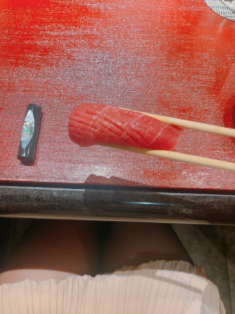 ◯マグロの漬け 目の前で20分漬けられた鮪が握られてきました。今日のはカナダ産、150kg。今の時期は国産より質がいいと思うとのこと。カナダより空輸で、冷凍じゃなく冷蔵で送ってくるそうです。空輸だから冷蔵で送れるそうです。