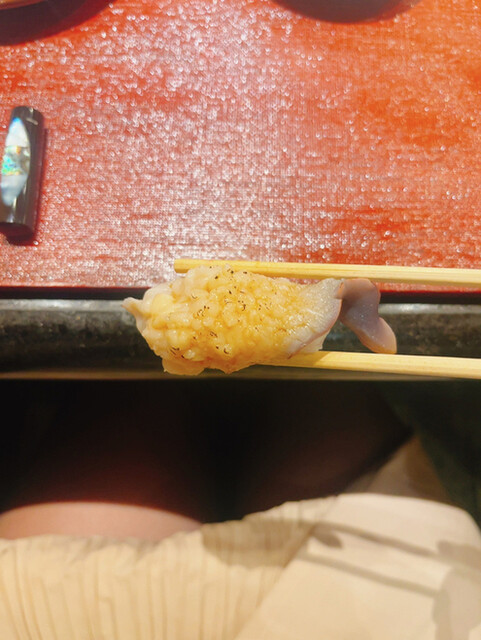 ◯あなご 関西風の蒸し寿司をイメージして作ってるそうです❗️あったかくてホカホカ❗️穴子も柔らかく蒸されています。いいですね〜〜❤️江戸前だけじゃなく、こういう関西風の仕事もちゃんとできて❣️他の江戸前しか出さない寿司店との違いを生み出せるお店です素晴らしい。