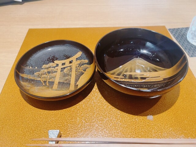 器が綺麗 鳥居と富士山。架空のシーンで実在しないデザインだとか。じゃがいもと山椒。
