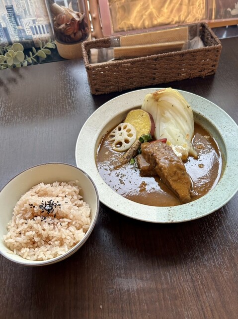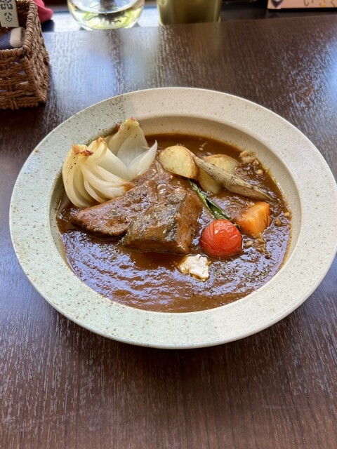 カレーはハンバーグと並んでこの店のイチオシメニューである。自称カレーマニアというシェフの渾身のオリジナルカレーはスープカレーのようなさらっとした食感と魚介ベースの濃厚な旨味が特徴。