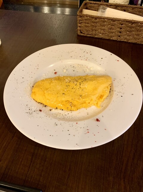 以前食べた「オムライス 黒(デミグラスソース)」もそうだったが、この店のオムライスのごはんはよくあるハムやチキンの入ったケチャップ炒めライスではない。トマトソースを加えた炊き込みピラフのような感じで、炒めてはあるのだろうが脂っ気が少ない。ケチャップのような甘さも無いのだが、それが明太子クリームと喧嘩せずに上手く調和している。その明太子クリームも明太子の風味はあるが、ことさらに明太子を主張しない。二つの穏やかな味わいがお互いを見事に引き立てあって、かなりの美味であった。