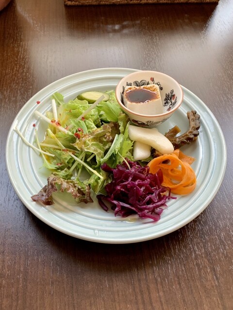 この店のサラダは毎回本当に美味しい。生野菜はもちろん、人参や紫キャベツのようにマリネした物やパプリカのピクルス、焼いたズッキーニまで素材の新鮮さ・味わいが口一杯に広がる。自家製のドレッシングは日によって味が微妙に変えられている。今日は無かったが、食満豆腐の絹ごし豆腐も非常に美味。それらが毎日ちょっとずつ内容を変えて提供される。唯一気になるのは、日によってボリューム・満足感の差がかなりあること。仕入れや客の数によるのかもしれないが、今日は豆腐が無いしボリュームも足りず残念だった。