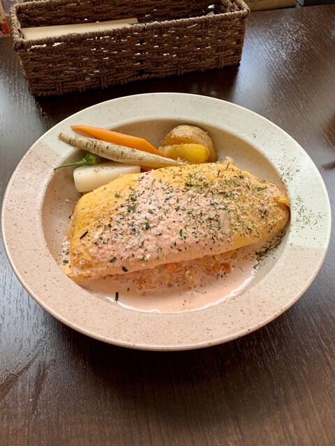 いつも通りカップスープに始まり、次にサラダが来たのだが、ちょっとびっくりした。いつもと比べてサラダの品数が少なくてどうにも寂しい盛りつけに思われたからだ。味はいつもと変わらず美味しいのだが、サラダはこの店の売りだと思っている僕としてはちょっと残念だった。たまたま仕入れが少なかったのだろうか?それとも今後こういうサラダになってしまうのだろうか?不安な気持ちになったが、次に来たメインの皿を見た瞬間に状況を理解した。