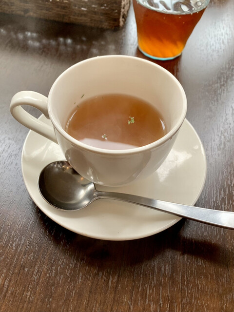 この店のサラダはいつでも本当に美味しい!今日は新たにピリ辛味の瓜?らしき物が入っている。毎回ちょっとずつ野菜を変えたり、見た目は同じでもドレッシングが変えてあったりと本当に芸が細かくて美味しいのだ。それと比べると、スープはこの三ヶ月ずっと同じだが、これもいずれ変化することがあるのだろうか?これから夏になって冷製スープになったり、冬にはポタージュになったり…、そうした変化があるとまたうれしいのだが、期待して待ってみよう。