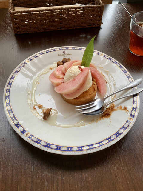 白桃とアイクリームを退けてタルトだけを食べてみると、白桃の風味と上品な甘さがとても美味しい!アイスクリームと一緒に食べると冷たさと甘さが足されてまた違う味を楽しめる。そこへ白桃を食べるとまた口の中に白桃の風味が蘇ってきて、繰り返し二つの味を楽しめた。皿の上にあるシロップと砕かれたクッキーも実に美味しい!