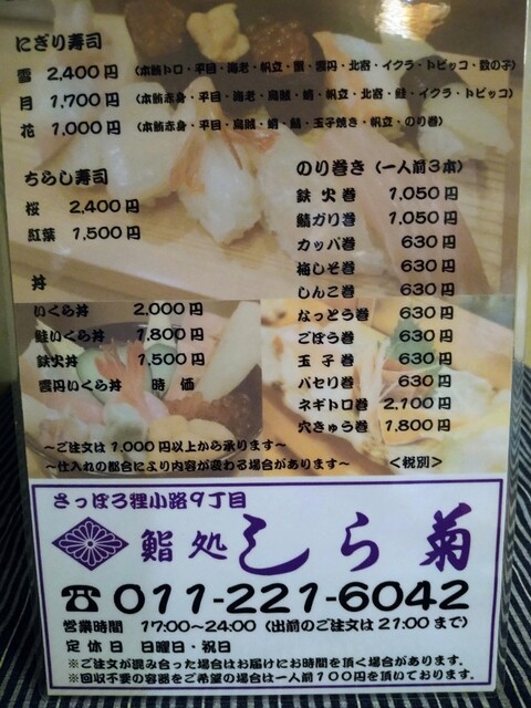 狸小路9丁目にある老舗のお寿司屋です。ご夫婦で営んでいる居心地の良いお店です。お手頃な価格で美味しい寿司が食べれます。お好みで注文も良いですし、セットにぎりがお得感があると思います。カウンターの席数は少ないですが、二階にも小上がりがありますので、宴会もできます。