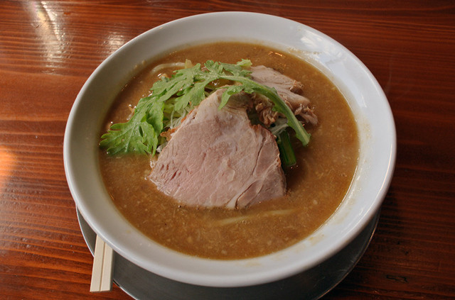 生の春菊が違和感無く食せちゃうくらい濃厚で肉々しくもあるスープですが、思った程脂分を感じなかった為なのか、クドさは控えめ。魚介系もしっかり主張してくる辺り、やはりこちらも和を感じます。画像では見えませんが、コリコリとしたメンマがいい箸休めとなりました。
