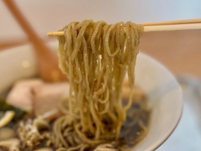 見た目とは裏腹に、調和の取れたとても穏やかなスープ。特徴のあるカエシを用いる一般的なブラックラーメンとは真逆の方向に振ったかのような印象。人生いろいろ、ブラックラーメンもいろいろって訳だ。