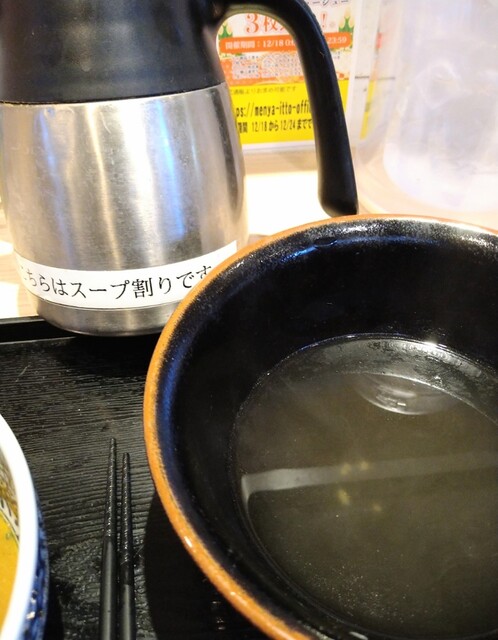 麺を食べ終えた際に、残ったスープにカウンターに置いてあるつけ麺用の割りスープを入れて少し薄めて飲むと、これがまた飲みやすくメチャクチャ美味い。