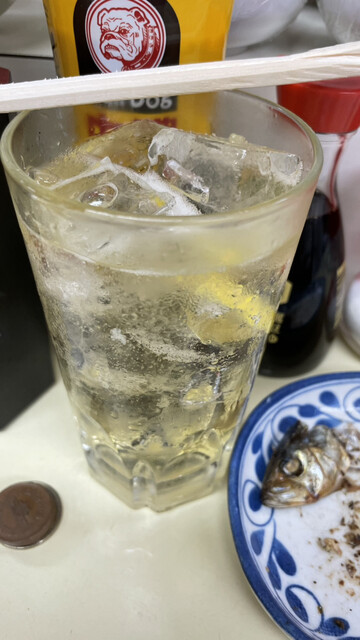 14:10位に訪問。開店間もないが入って左側の席はあと2席以外、常連様で埋まってました。いつもの休日ルーチンは、餃子の○将→○杯屋の後の3軒目に訪問するルーチンですが、今日は午前中に用事があったため、1軒目の訪問となりました。朝から何も食べていないため楽しみ倍増です。さて、まずはビールからで、アサヒスーパードライ大瓶550円と鳥もつ360円を注文。まだ開店間もないためか、鳥もつは大将が一生懸命に炊いていました。ビールが全身に染み渡ったところで熱々の鳥もつが到着。ひゃー、熱々!まずは七味を掛けてパクリ。レバーのねっとり感がたまりません。思わずビールを流し込みます。二口目はコリコリがたまらない砂肝?だと思いますが、間違ってたらすみません。3口目はハツ?ビール→鳥もつ→ビールの繰り返しで、あっと言う間に無くなります。一人言ですが、鳥モツに味の素をかけて食べると、旨みが増し美味しかったです。次に角ハイ260円と目ざし250円を追加発注。目ざしは焼いてあったものをチンして出して頂けます。目ざしの苦味がたまりません。角ハイ無くなり、お代わり260円。前から気になっていたハムカツ250円と角ハイお代わりで注文。これも予め揚げてあったものをチンして提供してくれるので、サクサクでは無かったです。ちょい残念でしたがソースをかけて頂きました。トースターで焼いて欲しかったなっと一人言。次に厚揚げ煮を注文。濃いめの味染み染みで酒が進み過ぎます。角ハイを更に2杯お代わりをしてお開きとしました。隣の方がけんちん汁をアテにしていたので、次回マネをさせて頂きます!合計2700円でした。ご馳走様でした!また来たいと思います。