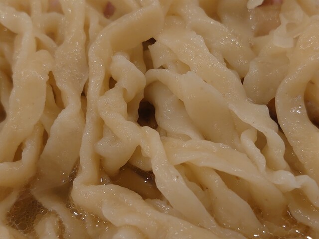期待通りの濃厚な煮干しスープと生姜。もともとコクがたっぷりだが背脂のリッチなボディ感でうまさがブーストされる!