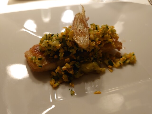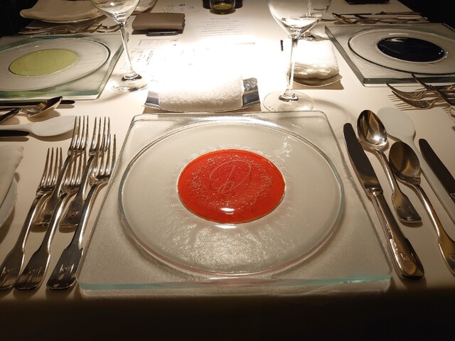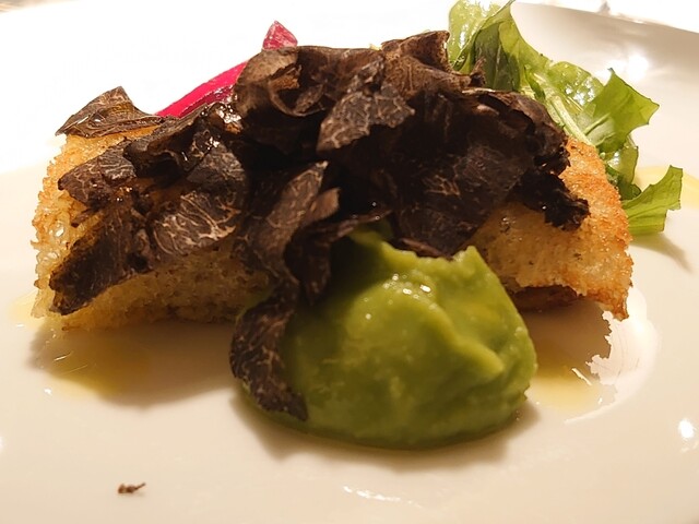 熱々の河豚の身と白子の上にたっぷりのトリュフ、そしてアーティチョークのアイスをあわせるお料理は美味しさと驚きがあふれるもの。温度が対局のパーツを盛る器もオリジナルのものとか。猪豚の火加減も神業だった。