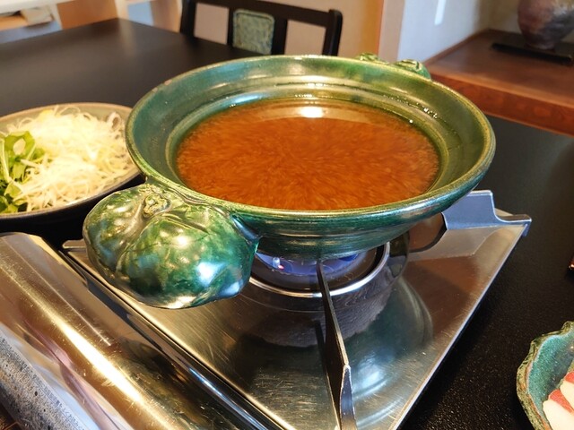続いて熊鍋。見た目はハリハリ鍋風。たっぷりの山椒と水菜(?)と一緒にいただく。驚いたのは熊の脂の香りとスープ、肉のうまさ!調理によって絶妙に熊肉の旨さが引き出されているのだろうがなんという絶妙さか!野菜もその汁が絡み、しゃきしゃき感と旨味が一体となる。