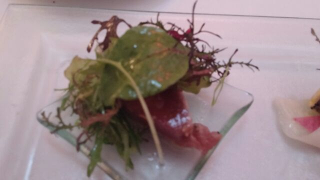 前菜1:戻りカツオのカルパッチョ(魚醤とアイオリ2つのソース)