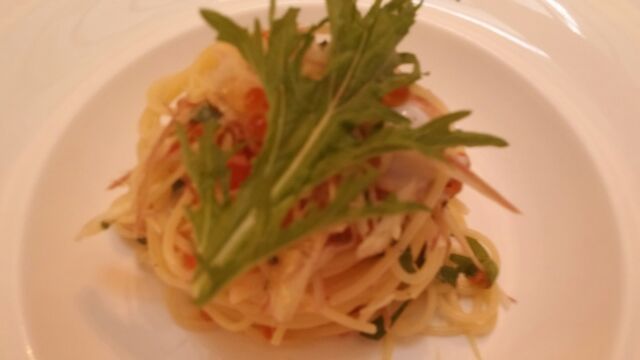 細打ちのパスタにイクラとタコの薄切り(少しの塩気で味付けされていました)に大葉とミョウガが味を引き立ててくれていました。