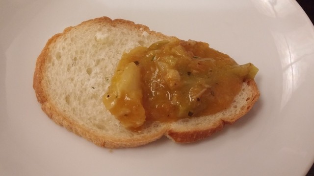 想像したのとちょっと違うビジュアルでしたが、トマトのほのかな甘酸っぱさとキャベツの甘みがよくマッチして豚肉の美味しさが引き立った料理です。野菜で肉の旨みを感じさせるってすごいですよね。わりと細かめに刻んであってスープも割とあるのでパンに乗せていただきます。例えがいまいちですが美味しい洋風もんじゃ焼きをパンにペーストしたって感じです。