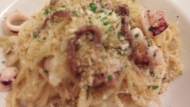 アンチョビベースのおいしいスパゲッティです。相変わらずのもちもちスパゲッティと小イカの食感がいいですね。