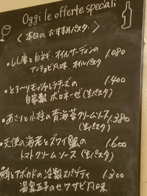 入り口前のボードみると、本日のスペシャルパスタ:牡蠣とほうれん草のトマトクリームソース