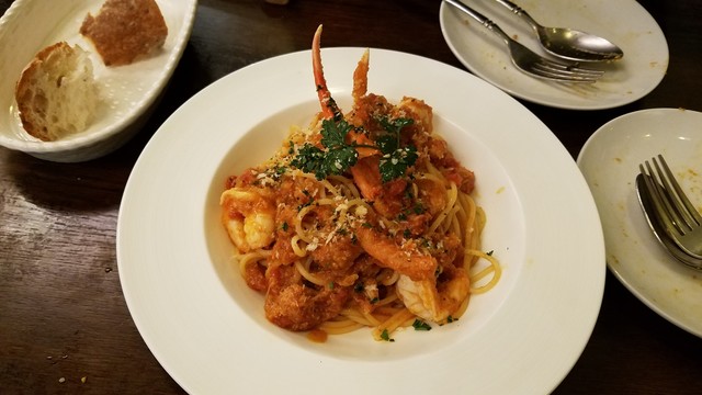 ただでさえおいしいトマトクリームソースにエビとカニの甲殻類独特の旨味をこれでもかと注ぎ込んだソースは、ただただ美味しいとしか言いようがないです。