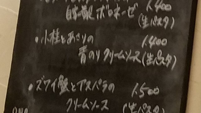おすすめボードの小柱と青のりのクリームソースパスタ。春らしい、美しいビジュアル。そしてお味は感動的。