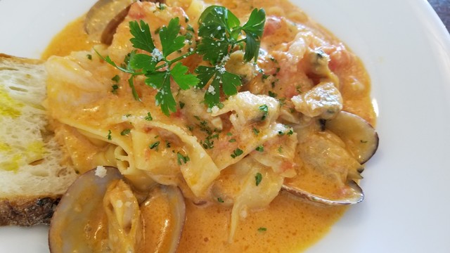 そしていつものトマトクリームソースのパスタは生パスタです。きしめんのようなタリアテッレにやや多めのソースと魚介の具材がたっぷり。