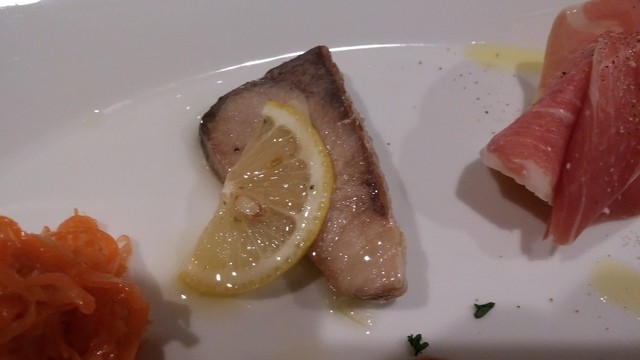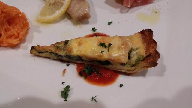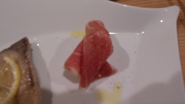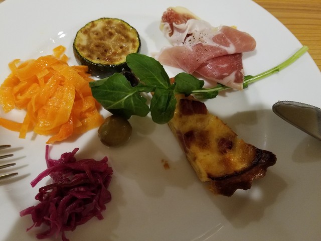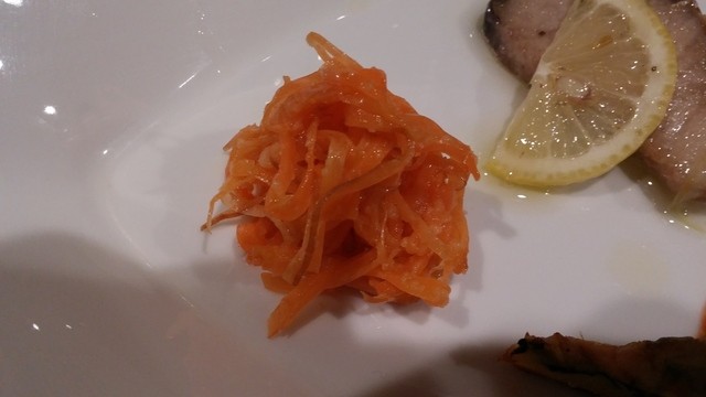 人参のラペ、(たぶん)ハマチの蒸したものにレモン汁搾りしたもの、生ハムに柿添え、ホウレン草とツナのキッシュの4種盛りです。中でもキッシュは抜群の美味しさでした。ケチャップ風のトマトソースは酸味抑え目でキッシュのこんがりとした風味がよく出ておりました。これでワインが進みだしましたねw