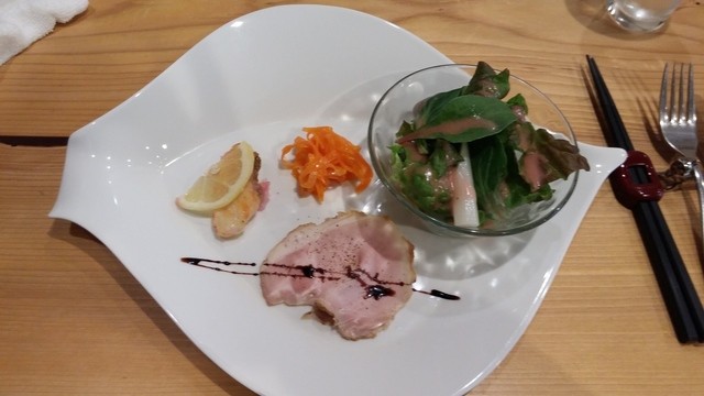 前菜プレート:人参のラベ・イチゴのドレッシングサラダ・真鯛のエスカベッシュ・三元豚のローストポーク