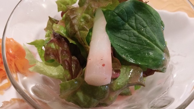 サラダのイチゴのドレッシングは酸味がきいたなかに、イチゴの爽やかな香りのする素敵なものです。