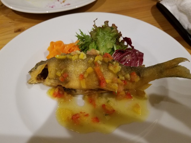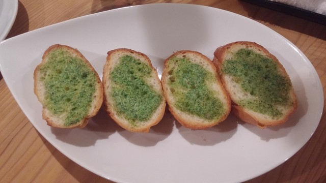 トマトのサイコロ状のソースと合わせて、添えられた野菜がパプリカやアスパラガス・チコリで彩り鮮やかで春らしい素敵なプレートになっています。ちょっとトマトのソースが弱めでもう少し味をなにか加えてほしかったところです。