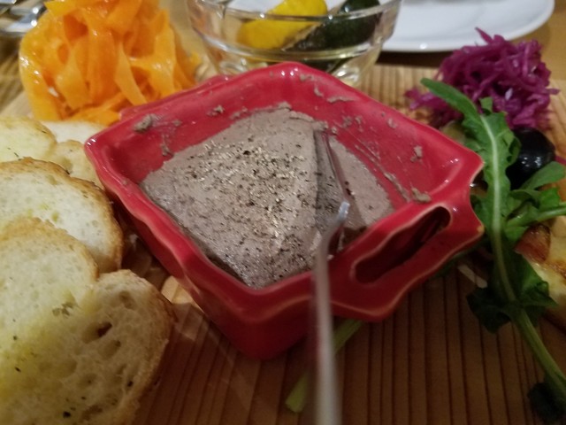 パテはペースト状のものを勝手に思い描いていたらテリーヌでした。すごい厚めに切って頂いていてボリュームもお味も大満足です。レバー尽くしですが、塩気が控えめで飽きることのないとても良いお味です。さらにワインがすすみます。