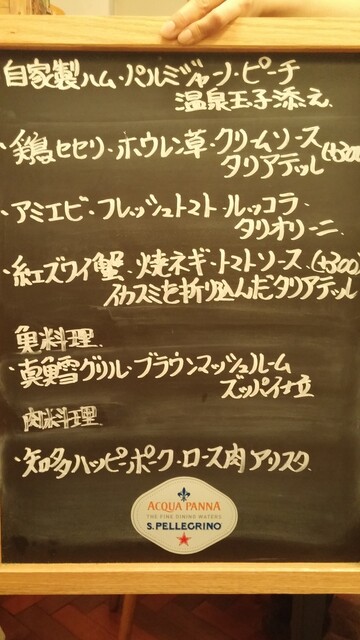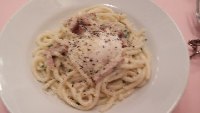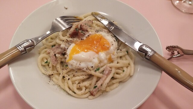 パスタはピーチといううどんのような白く太めのものです。そこにパルミジャーノと自家製のハムに温泉卵がトッピング