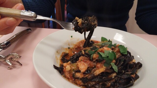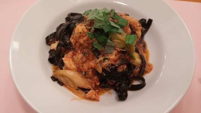 紅ズワイガニ・トマトソース イカ墨タリアテッレ
