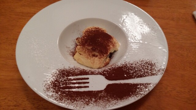 デザートは定番のティラミスでした。お皿にカカオで型どったフォークの絵がまたいいですね。