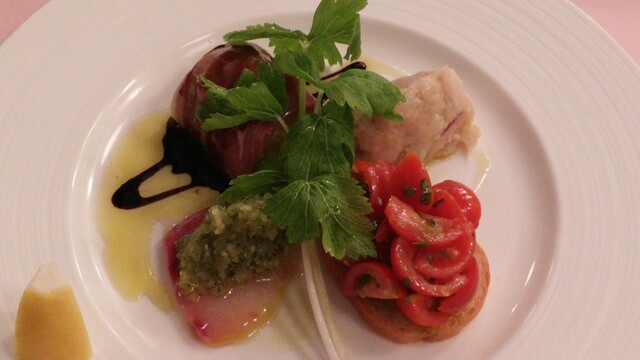 魚のスライスにピクルスのみじんをトッピング。酸味をきかせた味付けは夏を意識してでしょうか。