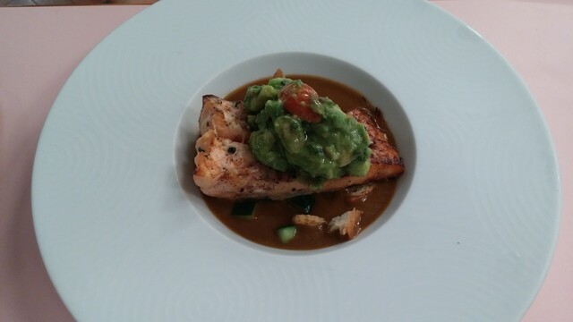 グリルしたサーモンを冷製スープにして、さらにアボカドディップをトッピング。スープはチャイプだろうか(?)香りとやや辛みのある葉野菜とオリーブオイルをポタージュにしたものです。香りが独特でややジェノベーゼ風の味わいながら、ちとえぐみが残念。