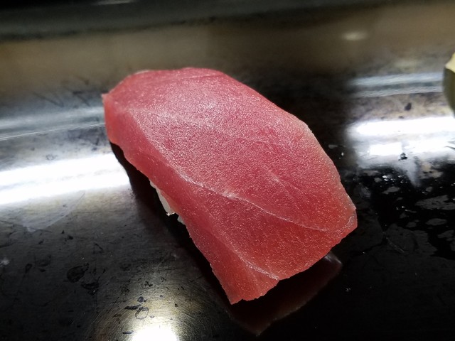 そして、今日は鮭の皮目を炙ったのがありました。表面はタタキのように炙ってあって中は超レアになっています。脂の乗りも最高!炙った皮の香ばしさも最高です。握りをもう一回お願いしました。北海道で食した「ときしらず」を超えています。