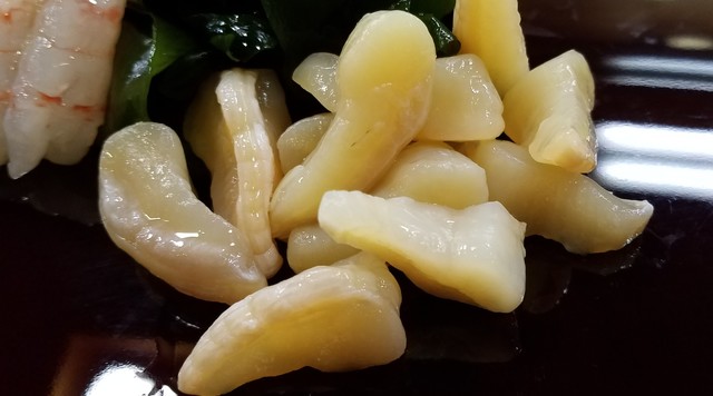 突き出しの鱈子の煮物は、お出汁の良さが光ります。ただただ、美味しいと思える一品から始まって、ちょいと小柱と甘えびをつまみに頂きました。