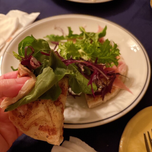 大人数の忘年会でお邪魔しました。前菜盛り合わせ、ボール一杯のムール貝、ピザみたいな生地にのったサラダ、お魚、お肉、パスタとどれも本当に美味しい!