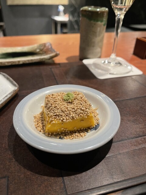 かぼちゃの胡麻豆腐は、トロッとした口当たりで濃厚ながらも優しい味わい。コースのスタートにぴったりです。