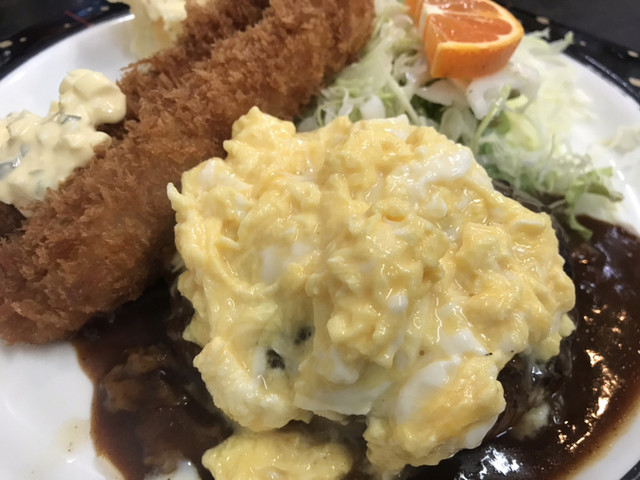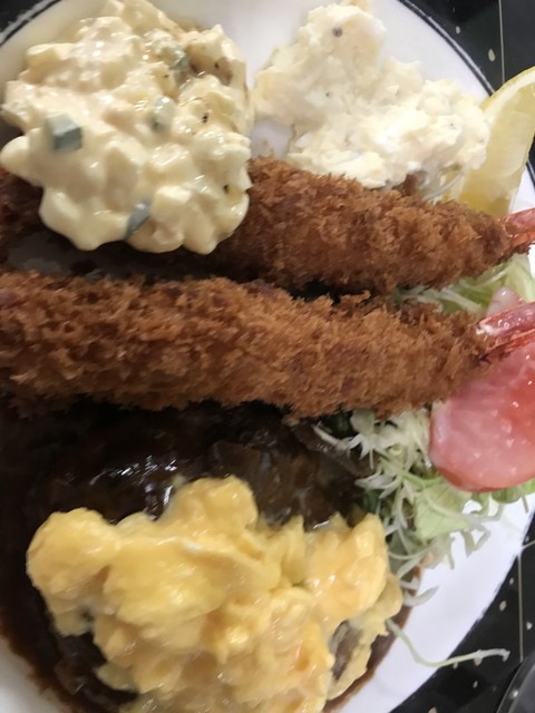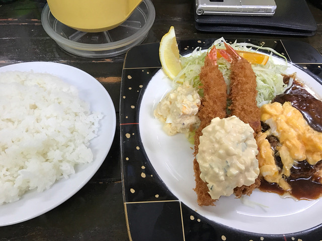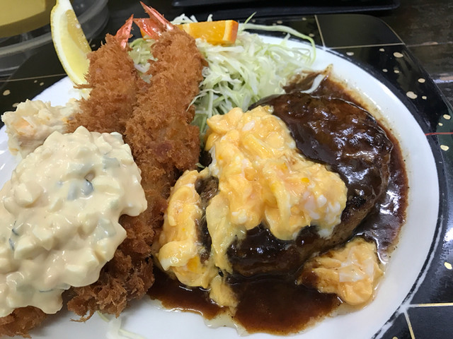 海老フライとハンバーグ