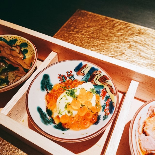 まず、出てきたのは、お皿の左から①牛蒡とインゲン、塩こんぶ和え、②卵のフラン、イクラがけ③ピリ辛トーチのよだれ鳥④大トロと伊勢海老の味噌とキャビア⑤卵黄と黒トフュフ、枝豆です。