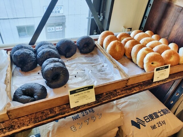 クランベリーとくるみのパン、レーズンとくるみのパン、真っ黒なチョコレートのベーグルを買いました。
